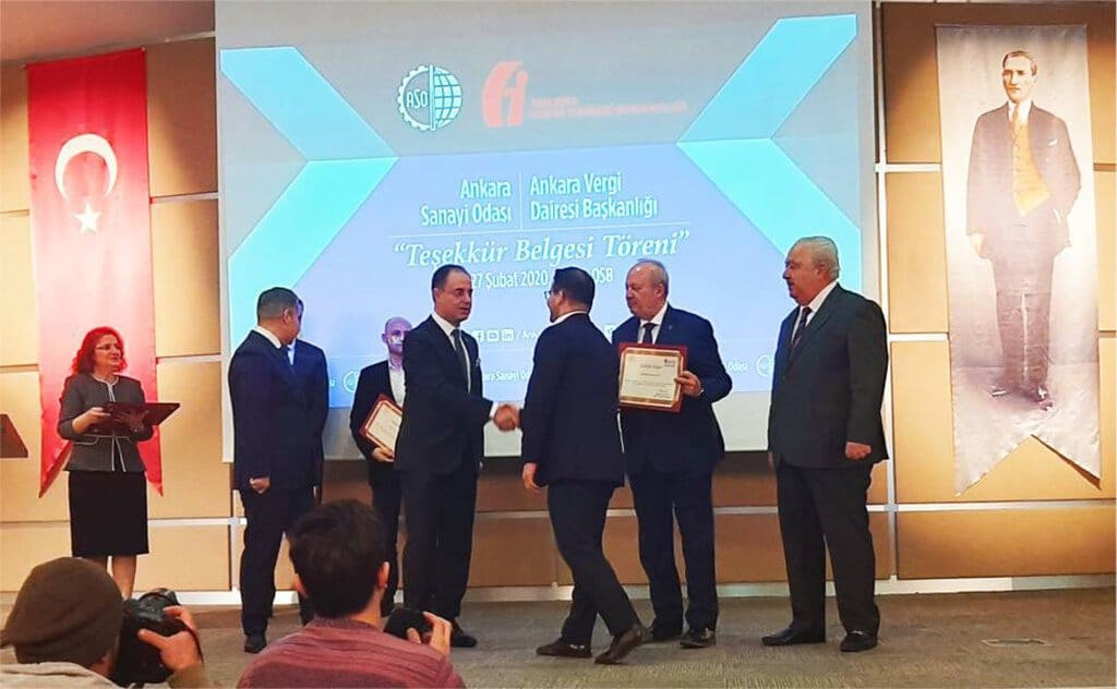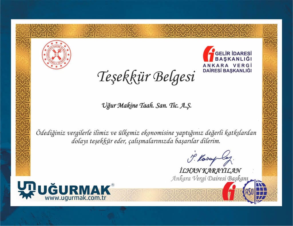 VERGİLENDİRİLMİŞ KAZANÇ KUTSALDIR. Ankara Sanayi Odası ve Ankara Vergi Dairesi işbirliğiyle ASO 1. OSB’de vergilerini zamanında ve yüksek düzeyde ödeyen, çok sayıda istihdam yaratan ASO üyesi 39 sanayiciye Ankara Vergi Dairesi tarafından teşekkür belgesi verildi. UĞUR MAKİNA ASO’da 39 firma arasında yer alan ve 2018 verileriyle en çok vergi veren 100 firma arasına girdi.