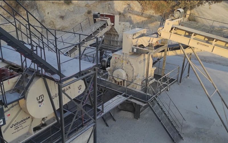 UMG03 Kaya Besleme Ünitesi (bunker hacmi: 30 m³, titreşimli besleyici ebadı: 1200x500mm) ile sisteme beslenen malzeme, ilk olarak UMK110 Çeneli Kırıcı’da (giriş ağız açıklığı: 1100x850mm) kırılmaktadır. Ardından SMK1115 Sekonder Darbeli Kırıcı’ya (rotor ebadı: Ø1150x1500mm) gönderilmektedir. UME2060 (elek ebadı: 2000x6000mm, 4 katlı) ikiz titreşimli elekler ile dört farklı ürün alınmakta ve +40mm malzeme yeniden kırılmak üzere UTK1115 Tersiyer Kırıcı’ya (rotor ebadı: Ø1150x1500mm) verilmektedir. By-pass malzemesi, sisteme girmeden ürün alınabilir veya UME1650 (elek ebadı: 1600×5000 mm, 3 katlı) titreşimli eleğe beslenebilir şekilde ayarlanmış olup by-pass eleğinden iki farklı ürün elde edilmektedir. Eleklerin alt katlarında tıkanmayı önlemek amacıyla tıkanmaz elek teli tercih edilmiştir. SMK1115 Sekonder Darbeli ve UTK1115 Tersiyer Kırıcı’da %21Cr-%1,5Mo alaşımlı çelik döküm paletler kullanılmıştır. Tesisin çalışması esnasında meydana gelebilecek tozun çevreye, çalışan sağlığına ve ekipmanlara olan olumsuz etkileri toz indirgeme sistemi ile kontrol altına alınmıştır.