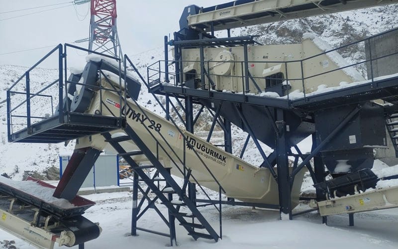 Primer olarak UMK serisinden giriş ağız açıklığı 1370×1000 mm, çıkış ağız açıklığı 125-300 mm olan 140’lık çeneli kırıcı tercih edilmiştir. Besleme ünitesi 40 m³ hacimli bunker ve 1350×5000 mm ebatlarında titreşimli besleyiciden oluşmaktadır. Sekonder kademede SMK serisinden Ø1280×1750 mm rotor ebatlı SMK1317 darbeli kırıcı kullanılmıştır. Çeneli kırıcının kırmış olduğu malzeme, ara stok alanından tünel besleyiciler ile sekonder kırıcıya beslenmektedir. UME serisi 2000×6000 mm 4 katlı ikiz elekler ile 0-5 mm, 5-15 mm, 15-25 mm ve 25-50 mm olacak şekilde sınıflandırılmakta ve üç farklı ürün alınmaktadır. +50 mm malzeme tekrar kırılmak üzere sekonder darbeli kırıcıya, ara malzeme ise UDK900 dik milli darbeli kırıcıya gönderilmektedir.