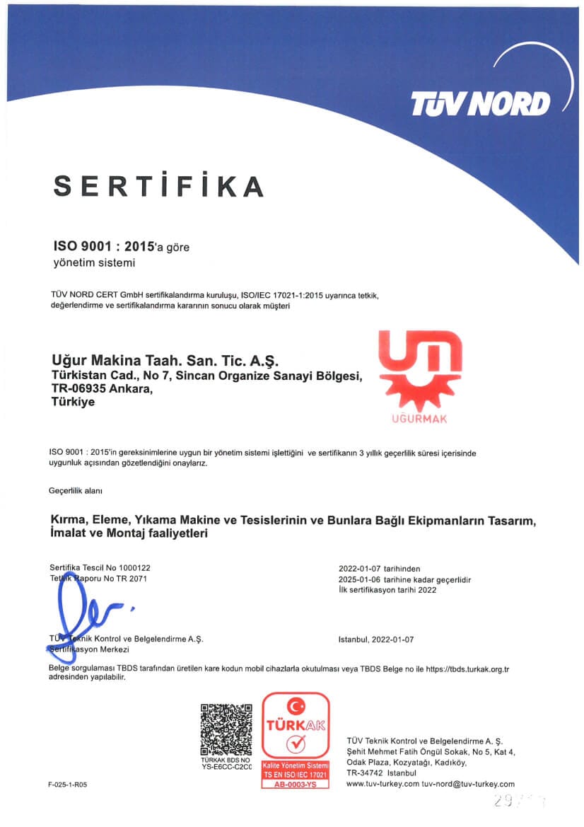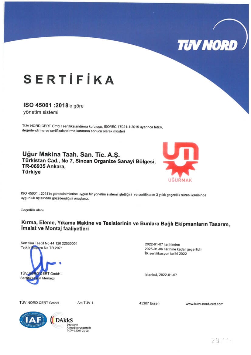 Uğur Makina olarak kalitemizden ödün vermeyip basitleştirilmiş süreç ve dokümantasyonun kullanımı ile verimliliğini artırmakta, sarf edilen çabanın tekrarlanma oranını düşürmekte ve sistem performansını iyileştirirken maliyetleri azaltmak kaliteyi arttırma amacıyla Tüv Nord la çıktığımız bu yolda UĞUR MAKİNA bir dünya markası olma yolunda ilerlemektedir.